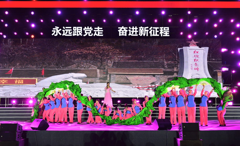 演出结束后,与会领导走上舞台,与演员握手、合影留念。