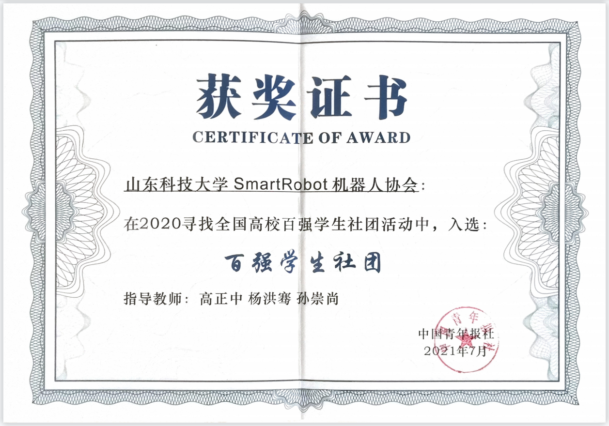 近日,由全国学联秘书处指导、中国青年报社主办的“2020寻找全国高校百强学生社团”活动评选结果揭晓,环亚在线官网SmartRobot机器人协会经过学校推荐、社团展示、网络投票、技术筛查、专家评审等环节,从来自全国各地1014所高校的3871个学生社团中脱颖而出,入选“2020年全国高校百强学生社团”。