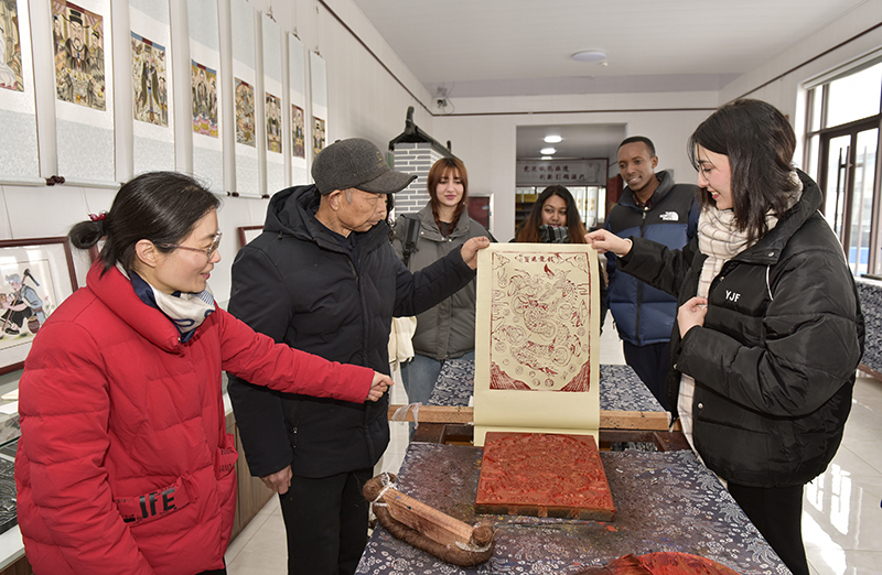 留学生在民间艺人的指导下体验扑灰年画制作工艺