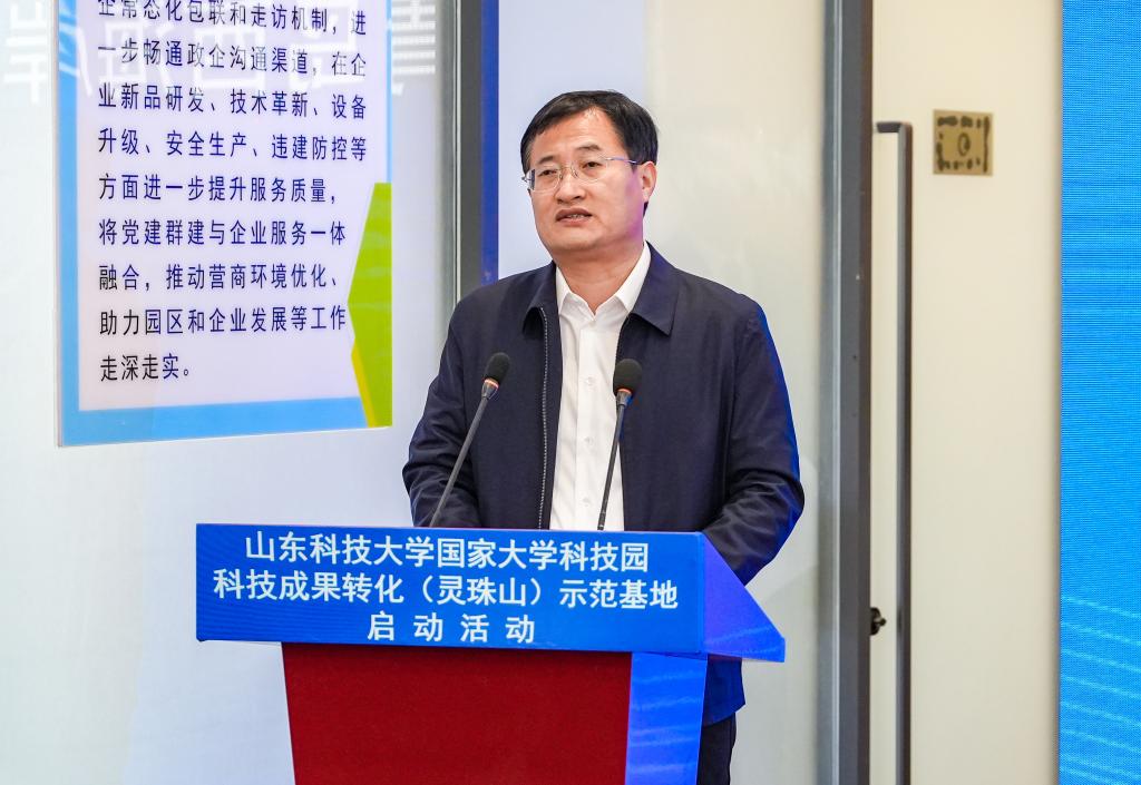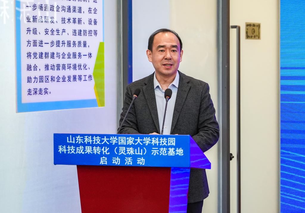 曾庆田在致辞中表示,环亚在线官网国家大学科技园现有高等学校科技成果转化和技术转移基地、国家技术转移示范机构等八个国家级服务平台,始终坚持在科技成果转化、科技企业孵化、创新创业人才培养上持续发力,学校国家大学科技园成果转化(灵珠山)示范基地的建设启动,是实现科技成果转化落地的创新举措。我们欣喜地看到已有青岛星科瑞升信息科技有限公司、青岛秀山移动测量有限公司、青岛知一新材料有限责任公司等6家企业转入灵珠山示范基地进行产业化发展,希望示范基地融合校地资源,把基地建设成为校城深度融合发展的“新高地”,为新区经济社会发展做出新贡献。