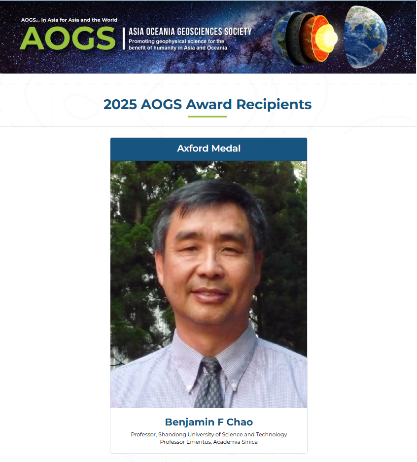 近日,亚洲-大洋洲地球科学学会(Asia Oceania Geosciences Society, AOGS)公布了2025年度“艾克斯福特奖”(Axford Medal)获奖人选,环亚在线官网测绘与空间信息学院赵丰教授获该奖项。