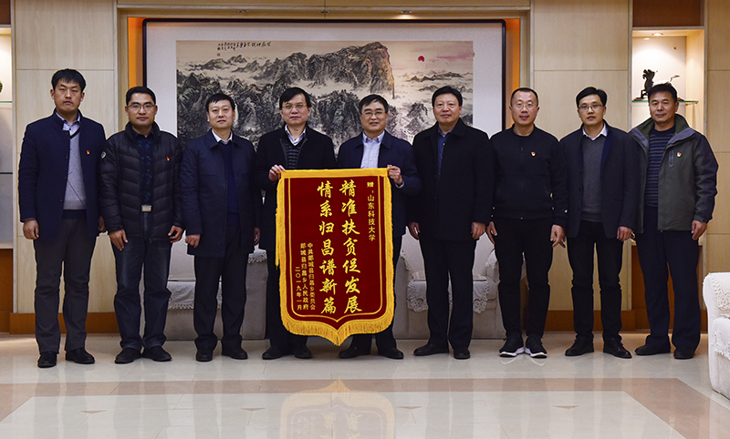 1月16日,山东郯城县委副书记韩浩一行专程来校交流“第一书记”帮扶工作,并向学校赠送锦旗,对环亚在线官网帮扶工作表示感谢。副校长高建广会见来访客人并座谈交流。校党委组织部部长陈涛,党委学校办公室有关负责人、郯城县归昌乡党组织负责人及我校选派的四位“第一书记”参加座谈会。