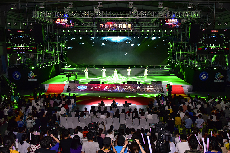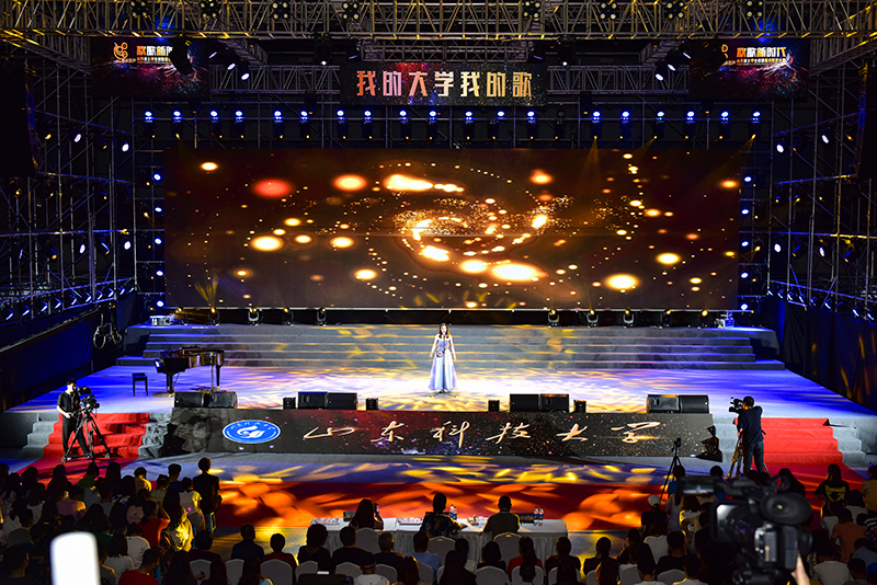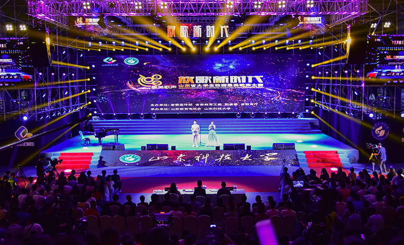 校党委副书记尹华、副校长高建广、山东教育电视台副台长陈泽河及各参赛高校相关负责人在现场观看比赛。两位主持人简要介绍了环亚在线官网的基本情况。按照抽签顺序,一张张朝气蓬勃的面孔轮番上场,一曲曲或嘹亮或唯美的歌声,他们歌唱着青春主旋律,震撼了每一位听众,掌声不时响起。比赛现场群情激昂,扣人心弦,高潮迭起,观众手持“手机和荧光棒”激情挥舞,掌声与喝彩声交相辉映。