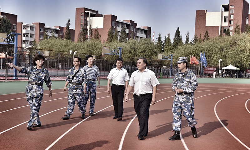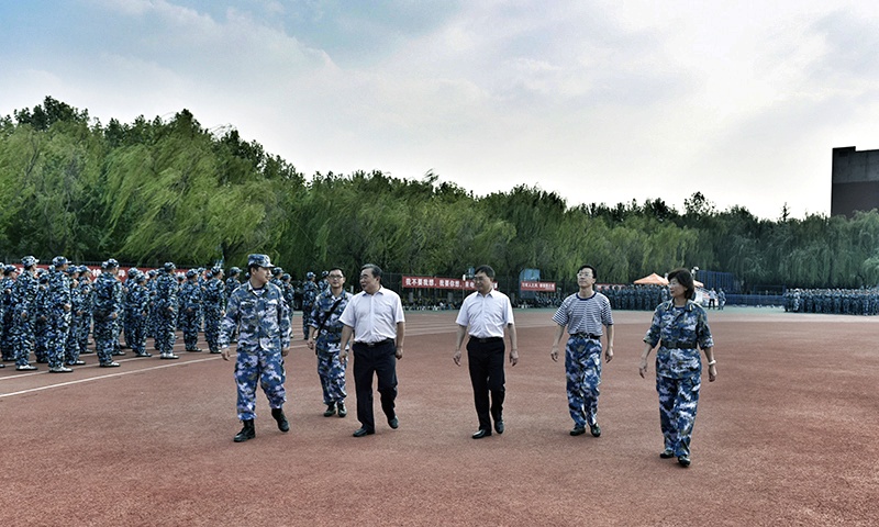 姚庆国一行在风雨操场、高地运动场等训练场地驻足观看,询问、了解学生的训练情况、身体状况以及在训练过程中遇到的困难,部分军训团教官向校领导汇报军训情况。姚庆国对教官们的辛勤付出表示感谢,对坚守岗位的辅导员表示慰问。