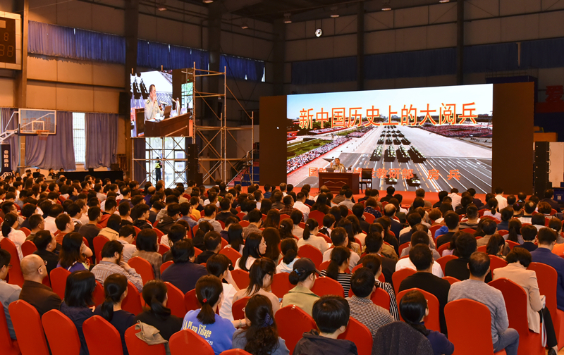 在将近6个小时的报告中,房兵教授回顾了新中国成立后的历次大阅兵,系统梳理了新中国安全环境发展演变的历史脉络,阐述了新中国武装力量发展壮大与国家安全环境发展演变之间的历史关系,点出了新时代深化国防和军队改革的重大历史和现实意义。他运用大量的事例、翔实的数据,从大阅兵展示的受阅阵容、装备情况、大阅兵背景下国际国内形势等方面逐一作了解读,同时解读了在历史进程中,中国如何进行军事变革、如何实现强军梦。房兵教授以他的爱国激情点燃全场,博得阵阵热烈掌声。