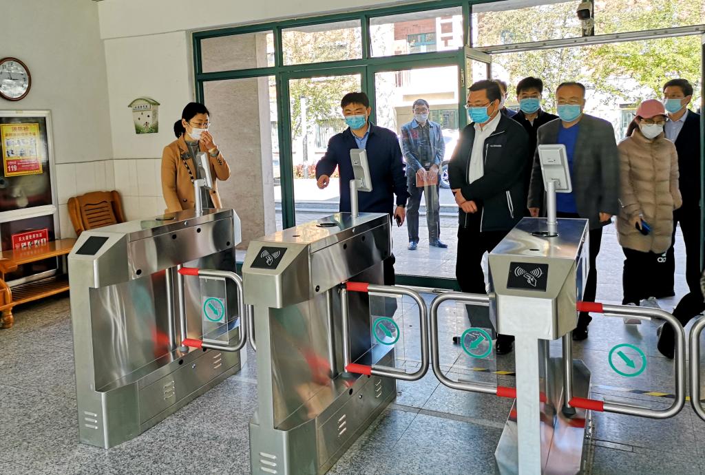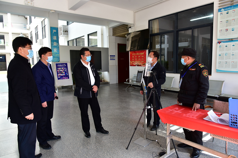 在教学楼,尹华一行对教学楼入口的测温设备使用和人员出入管理情况进行了查看了解,并叮嘱工作人员要严格落实防控要求,防控工作不松懈。