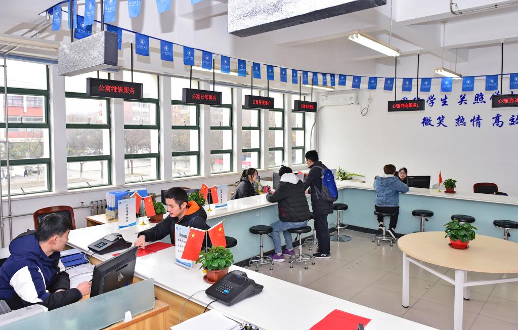 同学们在学生公寓服务大厅办理宿舍相关事项。