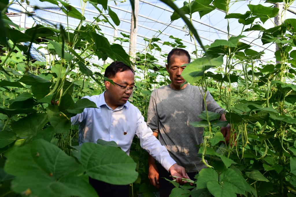 郭涛林(左一)查看大棚蔬菜长势