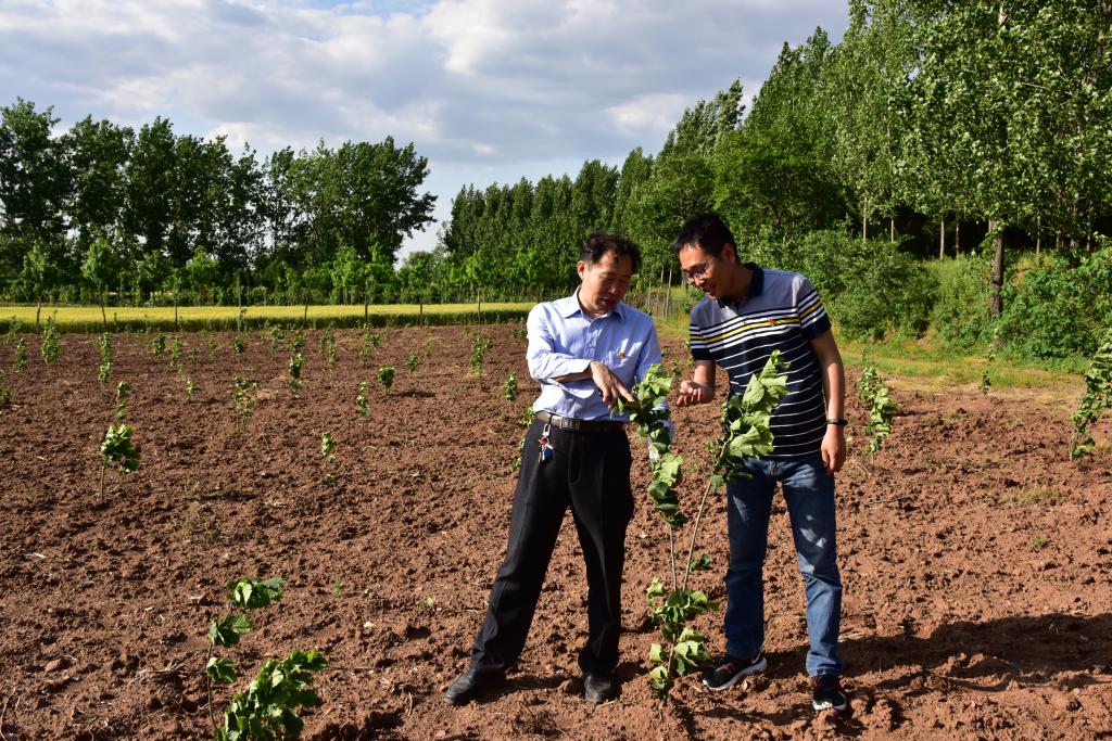 毛庆东(左一)与于海峰在榛子园调研