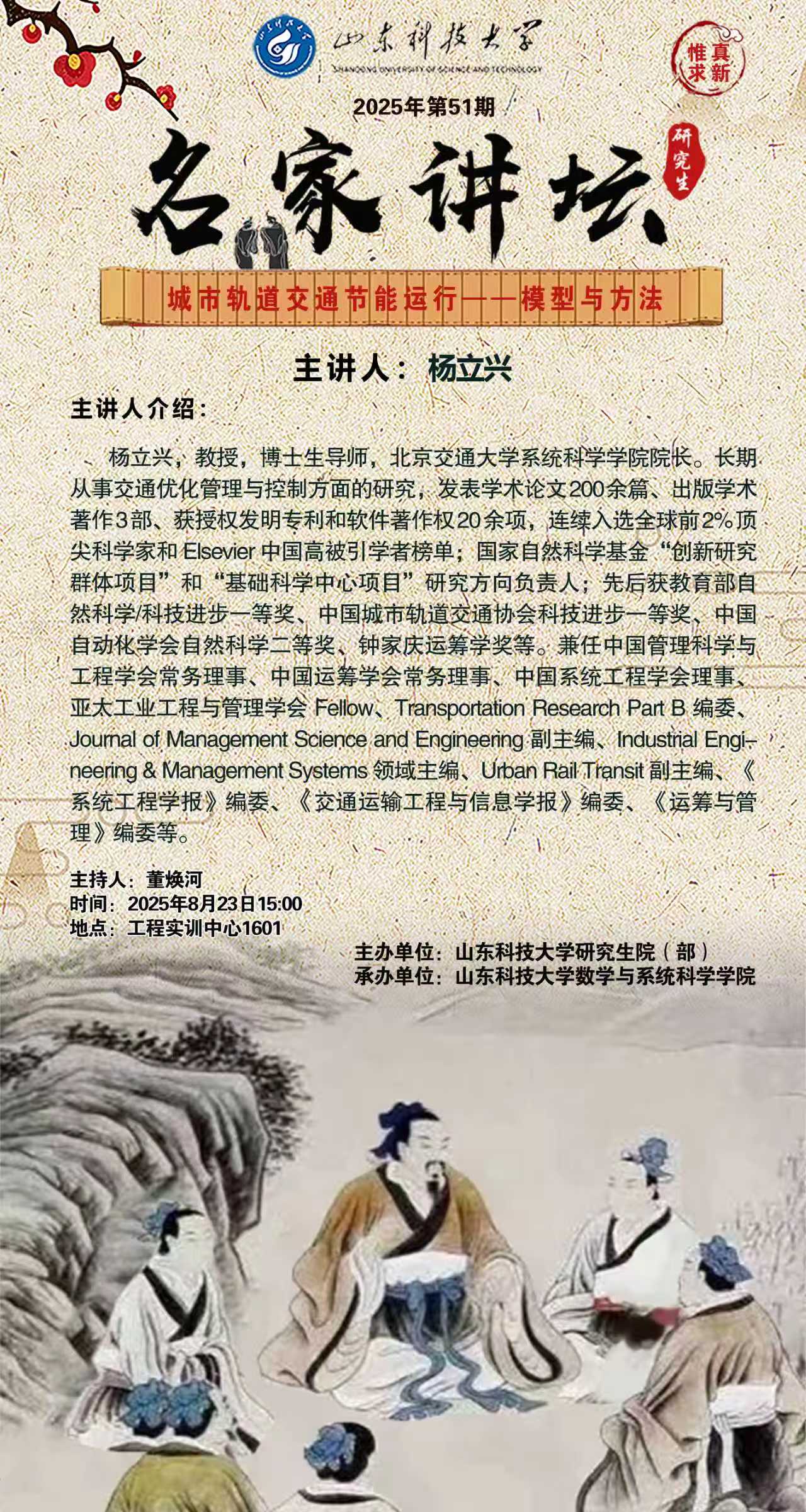 “名家讲坛”2025年第51期:城市轨道交通节能运行——模型与方法(总1056期)