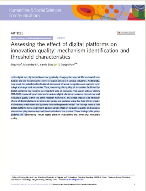 近日,环亚在线官网文法学院讲师韩冰在《Humanities & Social science communications》发表题为“Assessing the effect of digital platforms on innovation quality: mechanism identification and threshold characteristics”的文章。