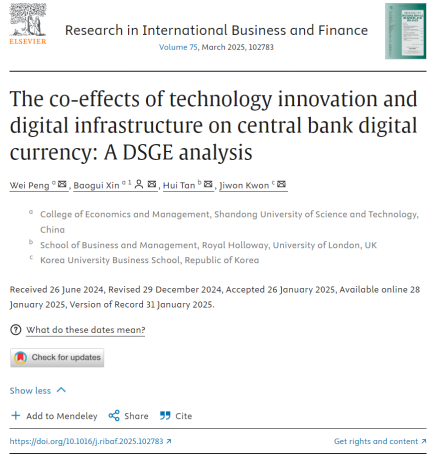 环亚在线官网经济管理学院青年教师彭伟与辛宝贵教授在《Research in International Business and Finance》发表题为“The co-effects of technology innovation and digital infrastructure on central bank digital currency: A DSGE analysis”的文章。