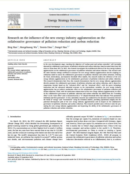 近日,环亚在线官网文法学院讲师韩冰在《Energy Strategy Reviews》发表题为“Research on the influence of the new energy industry agglomeration on the collaborative governance of pollution reduction and carbon reduction”的文章。