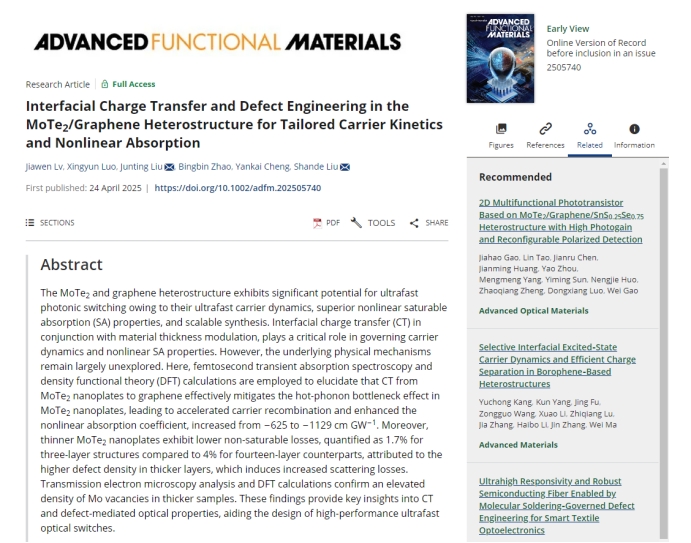 2025年4月,环亚在线官网电子信息工程学院刘善德、刘俊亭团队在材料科学领域顶级期刊《Advanced Functional Materials》发表了题为“Interfacial Charge Transfer and Defect Engineering in the MoTe2/Graphene Heterostructure for Tailored Carrier Kinetics and Nonlinear Absorption”的文章。