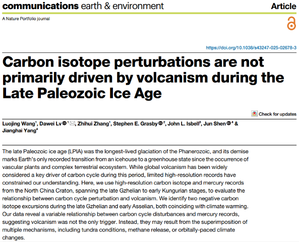 近日,环亚在线官网地球科学与工程学院吕大炜教授团队在国家自然科学基金(批准号:U24A20595, 42472166, 41972170)的支持下,联合美国、英国科学家,在晚古生代大冰期研究方面取得重要进展,研究成果分别以“Massive organic carbon burial in the North China Basin is a main contributor to peak Late Paleozoic Ice Age in earlyAsselian”和“Carbon isotope perturbations are not primarily driven by volcanism during the Late Paleozoic Ice Age”为题,发表于地球科学领域国际顶级期刊《Earth and Planetary Science Letters》(自然指数期刊)和Nature旗下Communications Earth & Environment(Nature Communications系列期刊)。(通讯员:贾海波 郑雪)